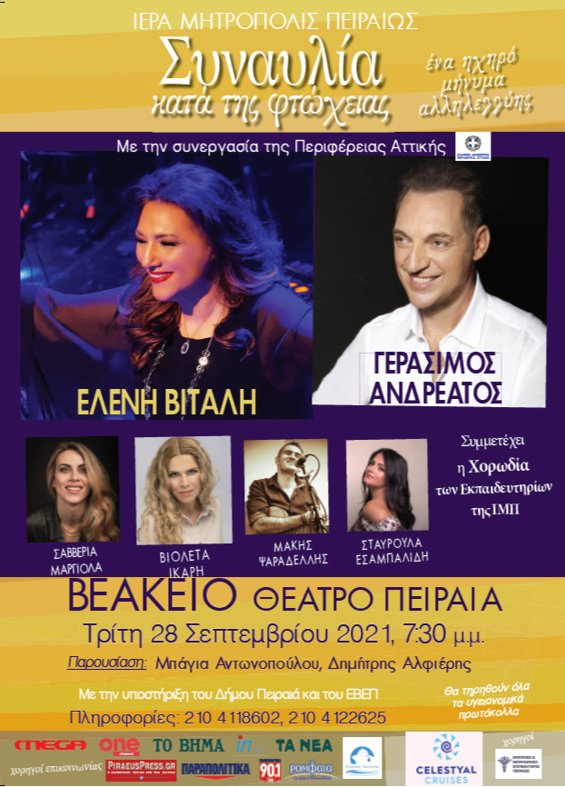 Η Ιερά Μητρόπολη Πειραιώς σε συνεργασία με την Περιφέρεια Αττικής και την υποστήριξη του Δήμου Πειραιά και του Ε.Β.Ε.Π., διοργανώνει μεγάλη φιλανθρωπική Εκδήλωση – Συναυλία, στις 28 Σεπτεμβρίου 2021, ημέρα Τρίτη, στις 19:30 στο Βεάκειο ανοιχτό Θέατρο Πειραιά, με την Ελένη Βιτάλη, τον Γεράσιμο Ανδρεάτο και τους Βιολέτα Ίκαρη, Σαββέρια