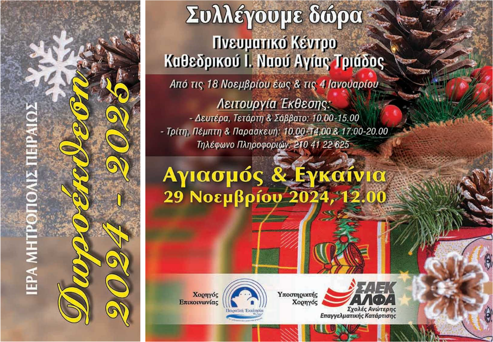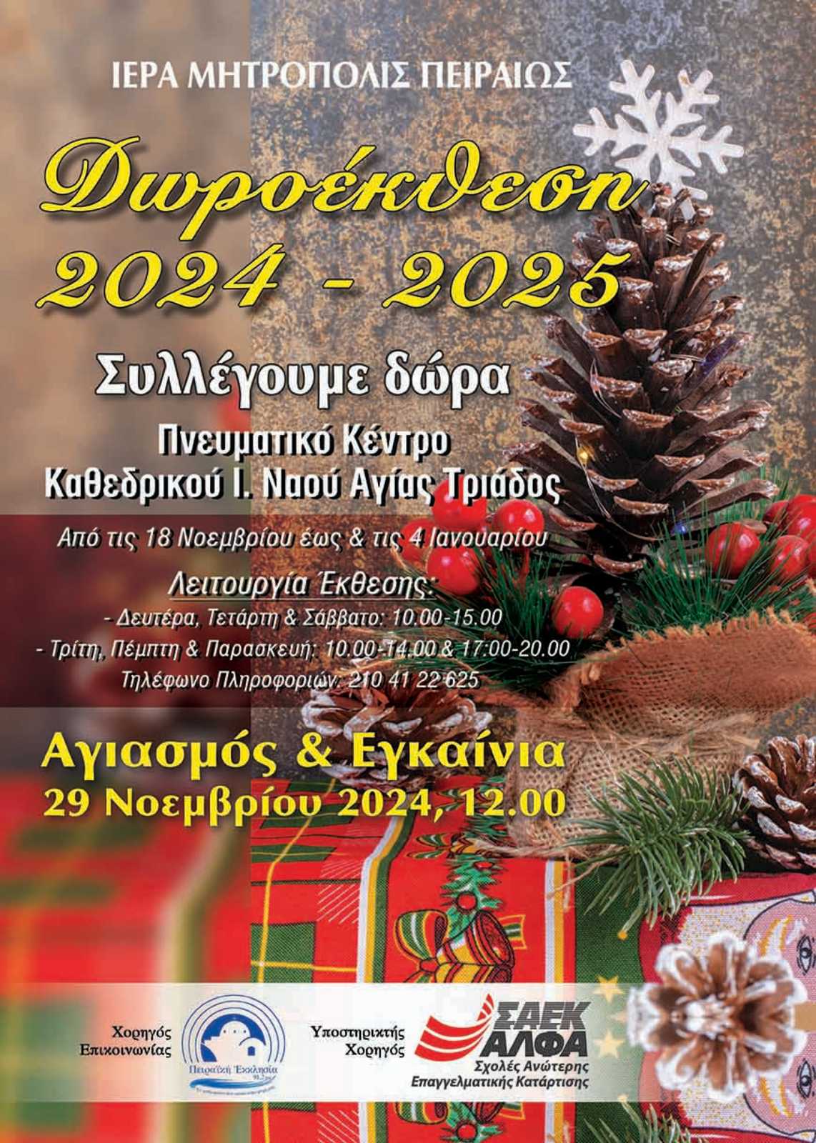 Η Δωροέκθεση της Ιεράς Μητροπόλεως Πειραιώς θα λειτουργήσει για μία ακόμη χρονιά στο Πνευματικό Κέντρο του Καθεδρικού Ιερού Ναού Αγίας Τριάδος Πειραιώς.