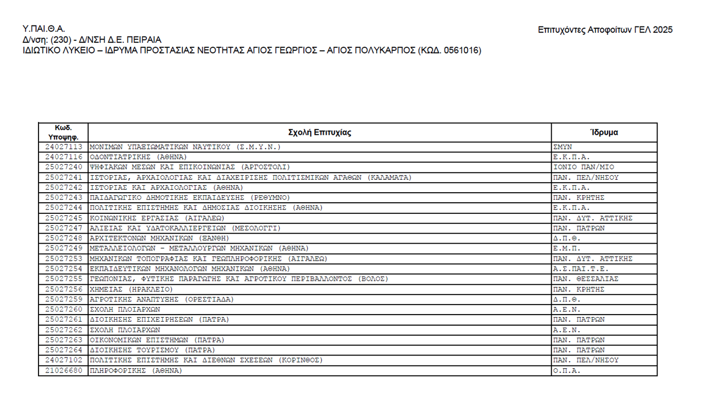 Ακολουθεί ο πίνακας των αποτελεσμάτων.
