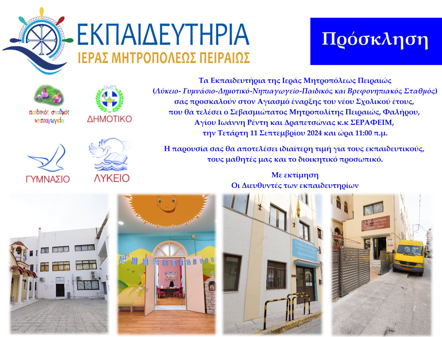 Για μία ακόμη χρονιά τα Εκπαιδευτήρια της Ιεράς Μητροπόλεως Πειραιώς, ανοίγουν τις πύλες τους, προκειμένου να υποδεχθούν τους εκατοντάδες μαθητές και μαθήτριες στην έναρξη της νέας σχολικής χρονιάς 2024 – 2025.